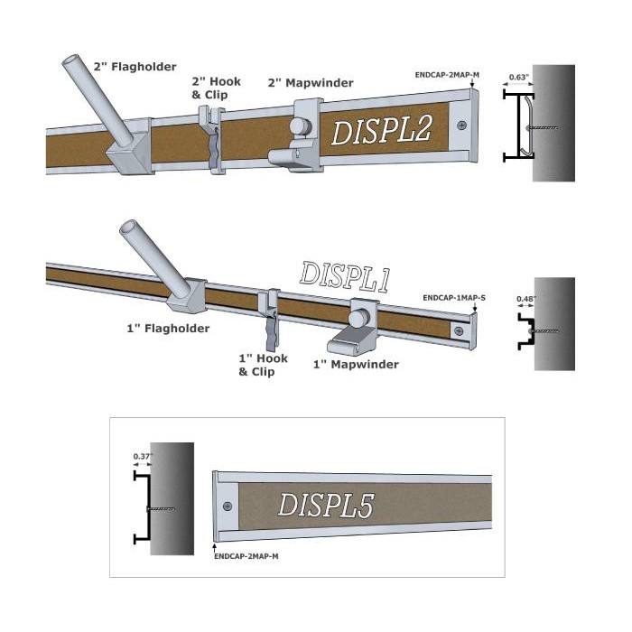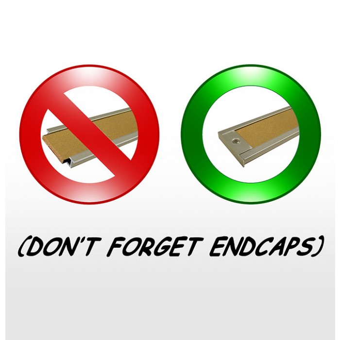 No map rail, cork strip or display rail is complete without the inclusion of End Caps. The clean design completes the precise lines and looks of the satin frame and matches perfectly to the anodized aluminum. It keeps the cork insert held flush and tight, which in turn will extend the overall life of your display unit. We can also match the depth of any trim piece with the selection of sizes we have to offer. Don’t let your display unit diminish the items you’re displaying, be sure to include End Caps.